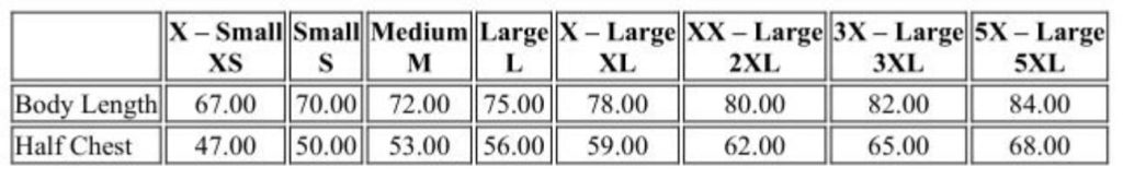Size guide: XS to 5XL (sizing chart attached).